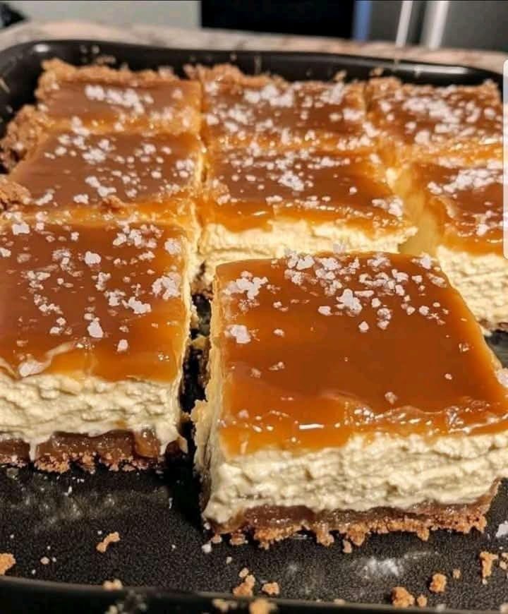 Estas barras de cheesecake con caramelo salado son una obra maestra de la repostería: elegantes, decadentes y absolutamente deliciosas. La combinación del cheesecake sedoso con el caramelo salado crea un contraste que enamora desde el primer bocado. ¡Un postre que no solo roba miradas, sino que pide repetición!