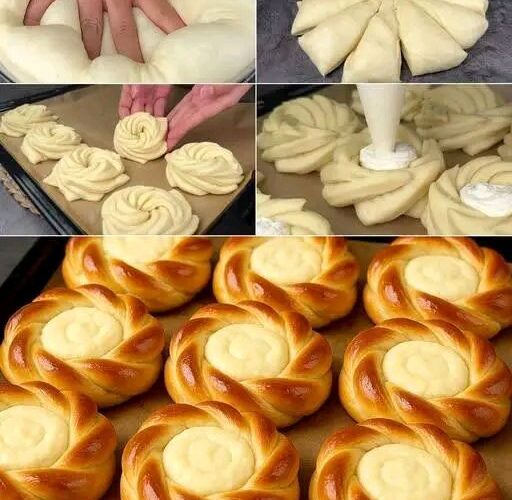 Los Bollos Rellenos de Crema de Requesón son una delicia de la repostería tradicional que combina la suavidad esponjosa de un pan dulce con la cremosidad sedosa de un relleno de requesón ligeramente endulzado. Estos bollos, populares en diversas culturas europeas y latinoamericanas, representan la perfecta fusión entre panadería y repostería, ofreciendo en cada bocado una experiencia reconfortante y satisfactoria. La masa levada, tierna y ligeramente dulce, abraza un corazón cremoso de requesón que se derrite en la boca, creando un contraste de texturas absolutamente irresistible. Perfectos para el desayuno, la merienda o como postre después de una comida ligera, estos bollos llenan la cocina con un aroma celestial mientras se hornean, convocando a toda la familia alrededor de la mesa. Su preparación, aunque requiere paciencia durante los procesos de fermentación, es un ejercicio de amor culinario que recompensa generosamente con resultados espectaculares. Descubra cómo crear estos bollos caseros que evocan tradición, calidez hogareña y el placer de disfrutar pan recién horneado con un relleno cremoso y delicioso.
