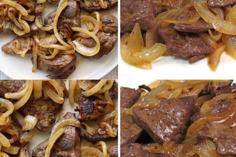 - Cocinar el hígado: En la misma sartén, reduzca el fuego y coloque los bisteces de hígado. Cocine por 4-5 minutos hasta que los bordes se doren ligeramente, luego déles la vuelta y cocine 3 minutos más.