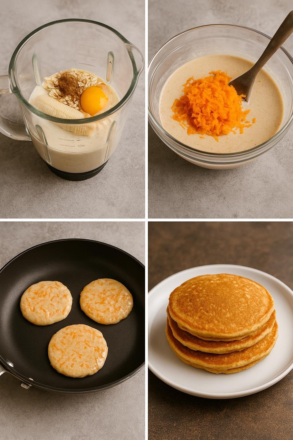 Transforma la avena en harina gruesa con un procesador. Ralla las zanahorias finamente (¡nada de tropezones!). Si usas plátano, tritúralo hasta lograr un puré cremoso.