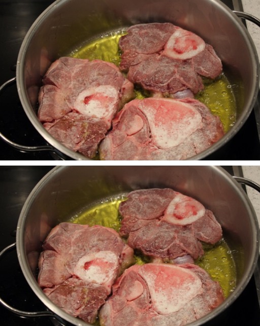 - Comece passando cada bife de ossobuco na farinha, sacudindo o excesso. Em uma panela grande, aqueça o azeite de oliva e sele os bifes até que estejam dourados dos dois lados. Retire-os e reserve.