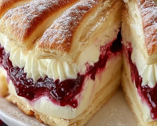 Este exquisito pastel de hojaldre, crema y mermelada es la combinación perfecta de capas doradas y crujientes, un relleno sedoso y una capa dulce de mermelada. Coronado con frutos rojos frescos y un toque de crema batida, es el postre ideal para sorprender en cualquier ocasión, desde una merienda hasta una celebración especial. La mezcla de la masa hojaldrada, la crema suave y el toque ácido de la mermelada lo convierte en una experiencia inolvidable en cada bocado.