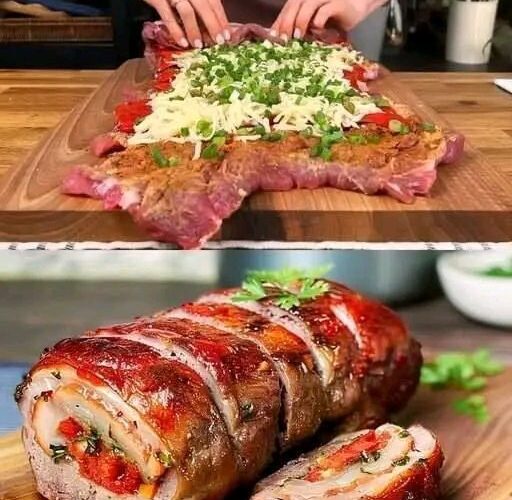 - Enrolla la carne cuidadosamente y amárrala con hilo de cocina para que el relleno no se salga.